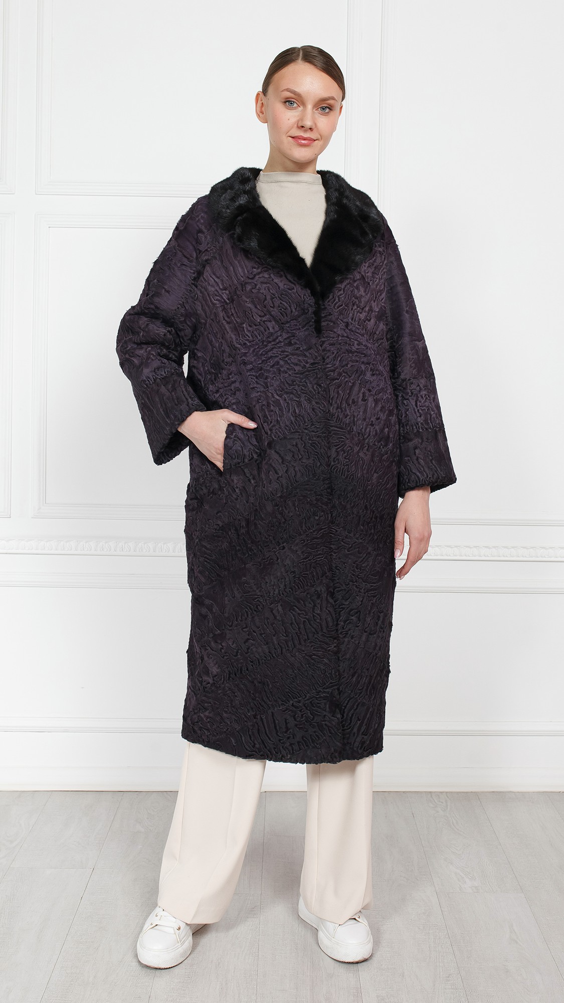 Шуба из свакары, отделка норка